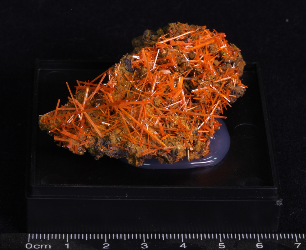 A piece of matrix with attached lustrous crocoite crystals